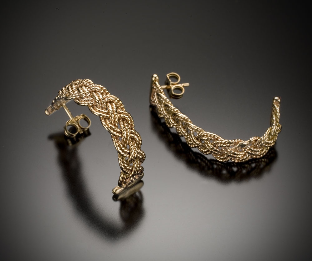 14 Karat Yellow Gold hand woven earrings, set on posts. Half-circle design.